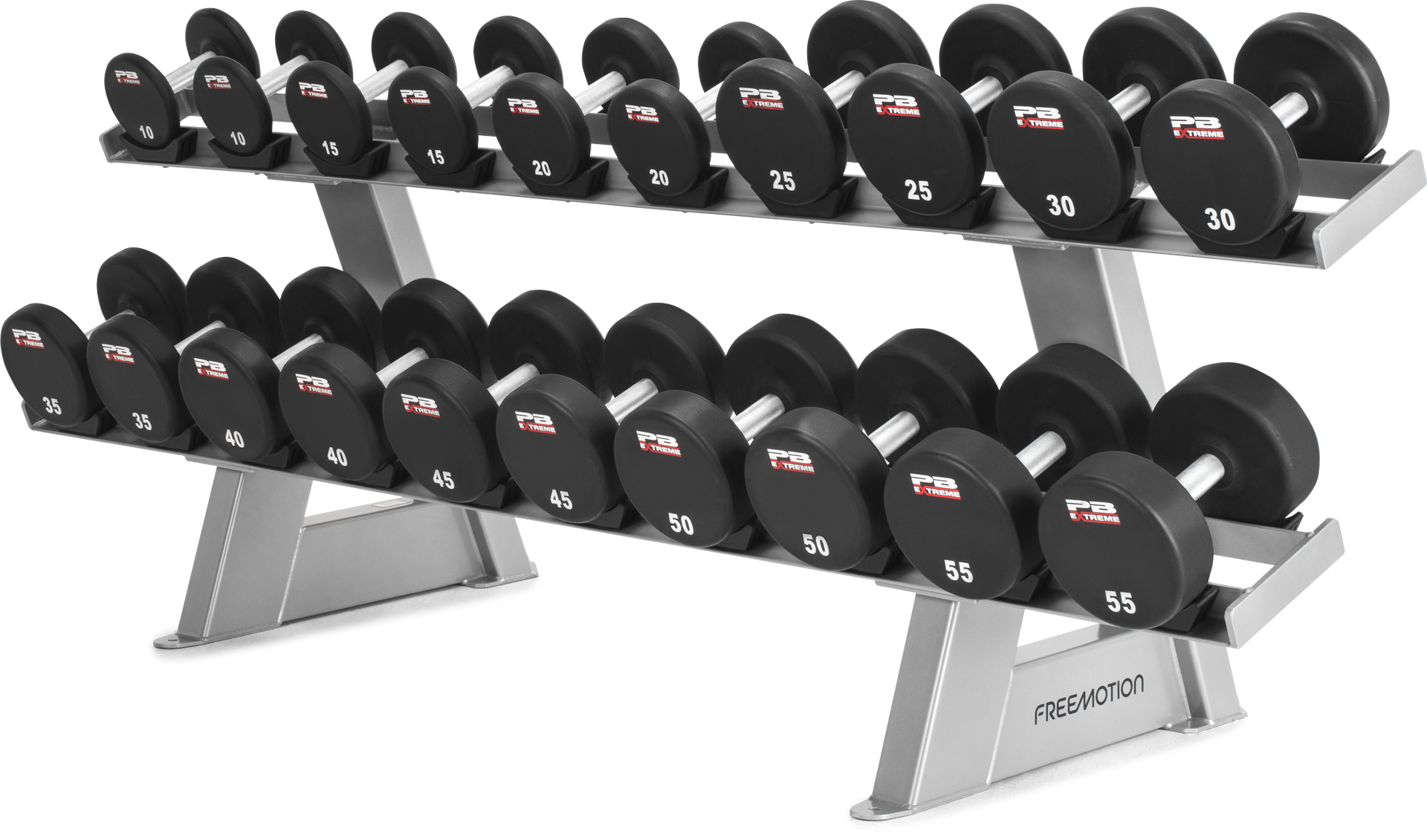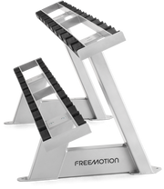 Bieten Sie Ihren Mitgliedern eine sichere, zuverlässig organisierte workout mit dem EPIC Twin Tier Dumbbell Rack. Dieses Freemotion-Rack fasst bis zu 20 Standardhanteln (bis zu 2.500 lb) mit geformten Hantelhaltern, die die Gewichte schützen und ein Wegrollen verhindern. Die Schraublöcher können für zusätzliche Stabilität am Boden befestigt werden; der robuste Stahl und die elektrostatische Pulverbeschichtung verleihen ihm ein elegantes Finish.